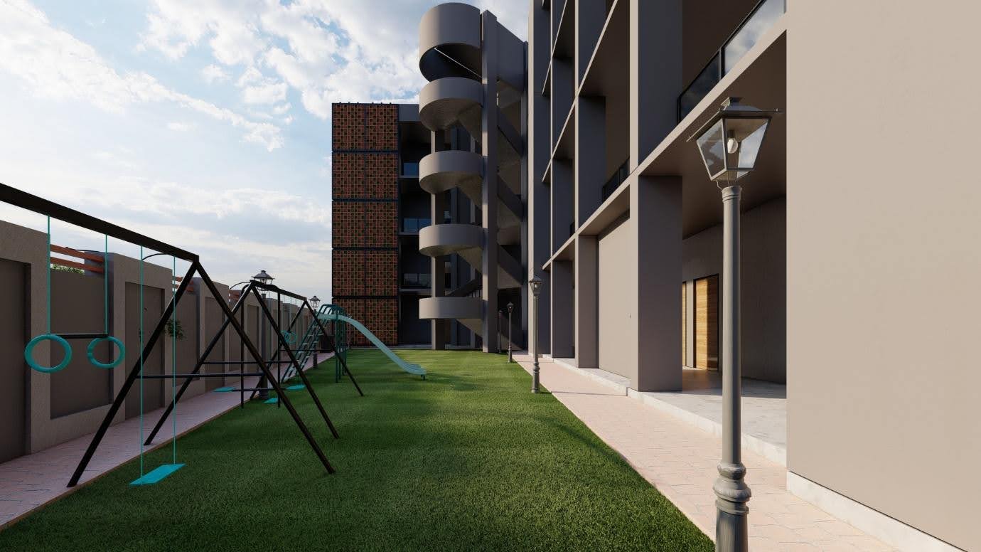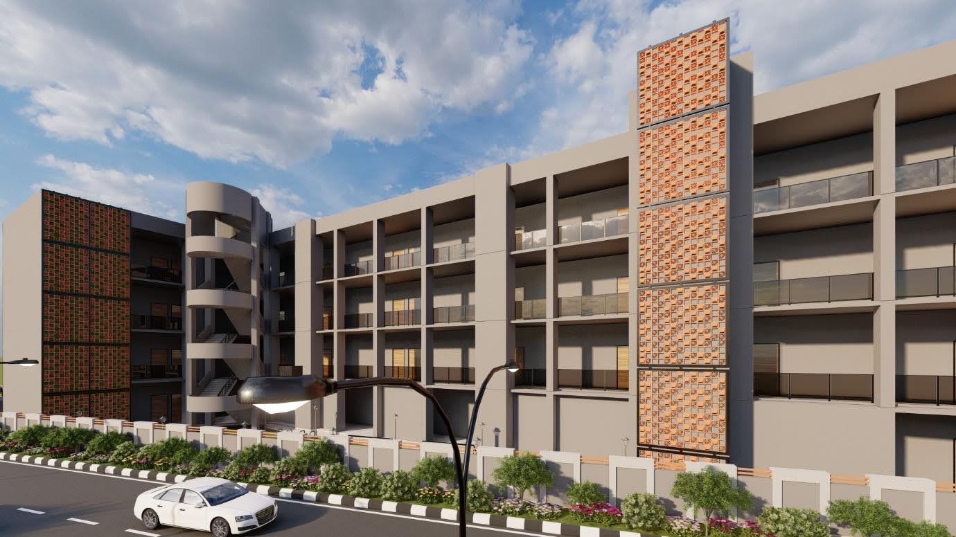 This 1700 Sq.M exterior project for the Govt. School in Panipat, started in May 2020, focuses on a robust and modern institutional design. The architecture features a strong, grid-like facade, balanced with a distinctive brick jali (latticework) for ventilation and visual interest. The design also incorporates functional outdoor spaces, including a dedicated playground and external circular staircases, creating a durable and inspiring environment for education.